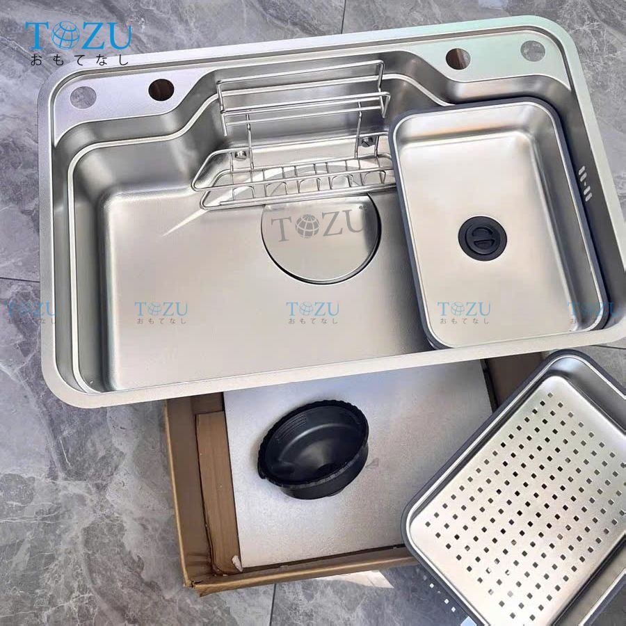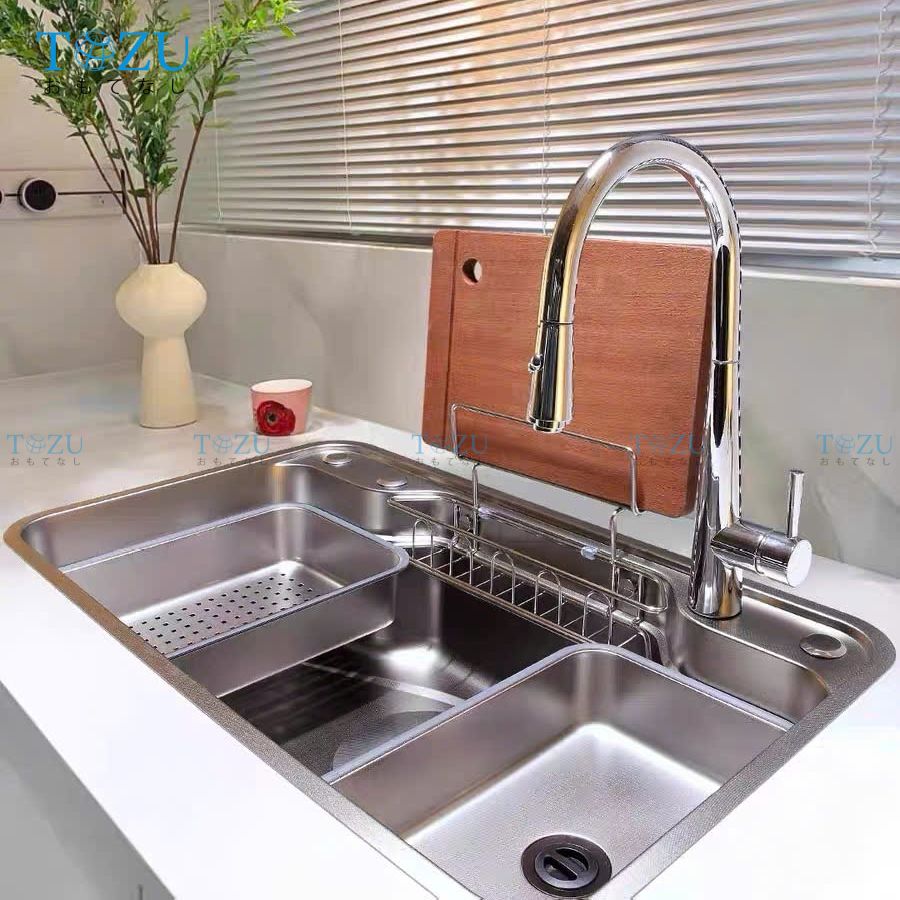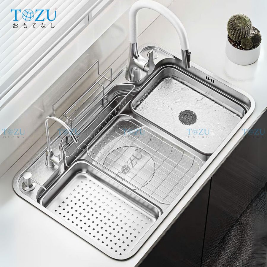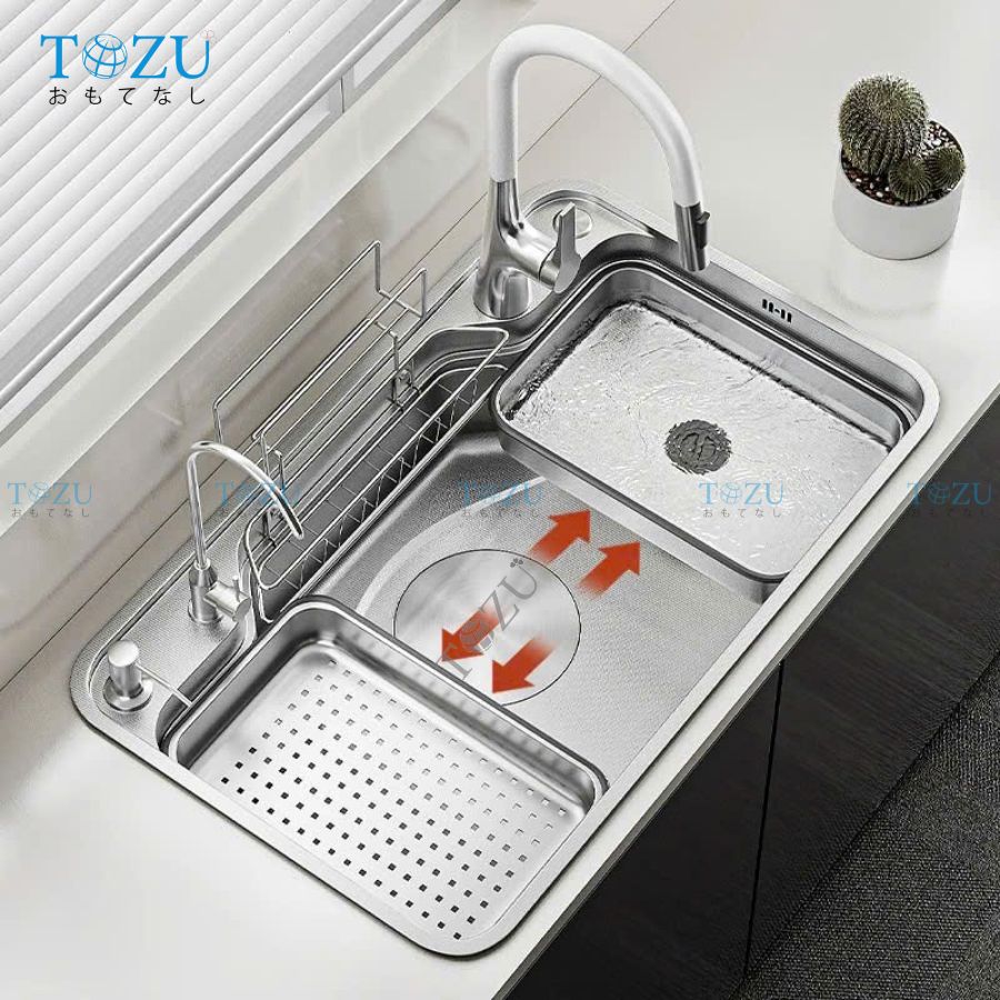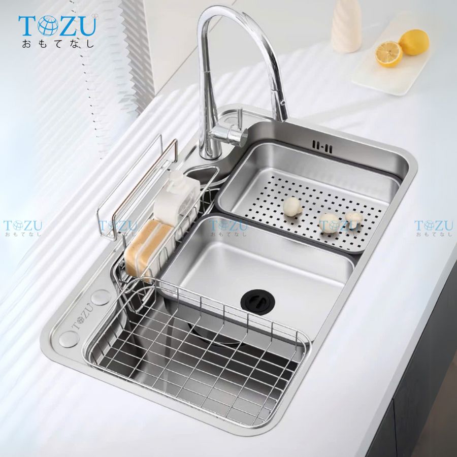 Lòng chậu sâu, hố chậu lớn, được thiết kế gờ hạ bậc thông minh, cho phép tích hợp phụ kiện làm bếp như thớt, rổ, chậu mini,... giúp bạn tiết kiệm thời gian làm bếp hiệu quả